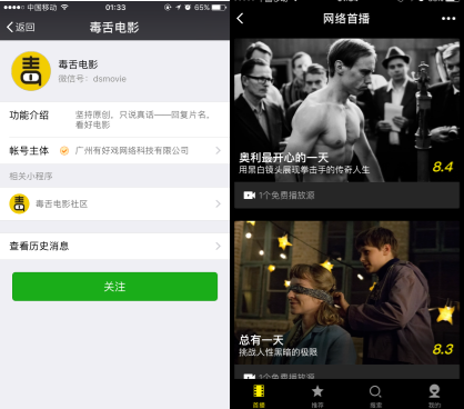 左為公眾號介紹頁;右為公眾號主體開發(fā)的小程序